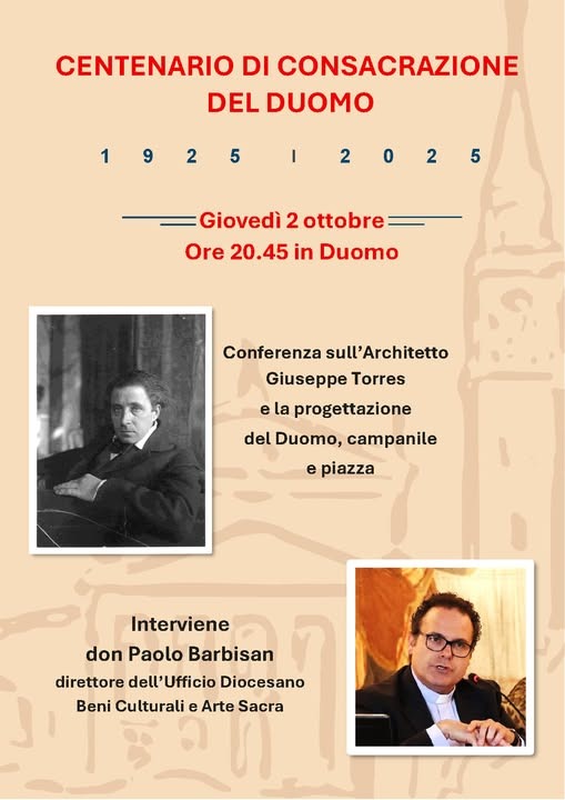 Gli appuntamenti per il centenario del Duomo di San Donà di Piave volgono al termine. Giovedì 2 ottobre alle 20.45 presso il Duomo di San Donà si terrà una conferenza sulla figura del suo autore, l’architetto Giuseppe Torres, a cura di don Paolo Barbisan, direttore dell’Ufficio Beni Culturali e Arte Sacra della diocesi, incaricato Unico Triveneto per i Beni Culturali Ecclesiastici e l’Edilizia di Culto.